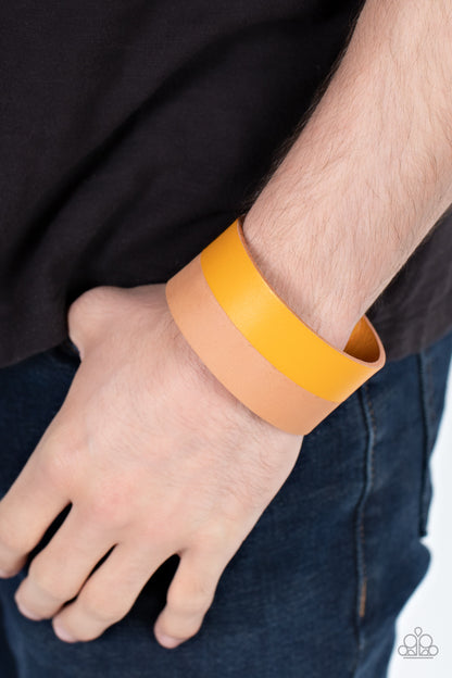 Edgy layers of light and dark yellow leather wrap around the wrist for a down-to-earth fashion. Features an adjustable snap closure.